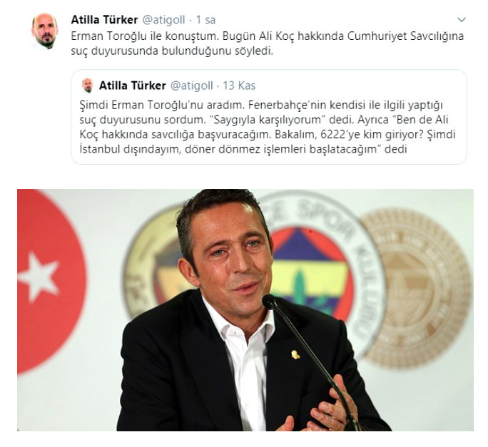 Toroğlu da bu gelişme üzerine Fenerbahçe Başkanı Ali Koç hakkında suç duyurusunda bulundu. Ajansspor yazarı Atilla Türker, Twitter hesabından yaptığı paylaşımda, "Erman Toroğlu ile konuştum. Bugün Ali Koç hakkında Cumhuriyet Savcılığına suç duyurusunda bulunduğunu söyledi." dedi.