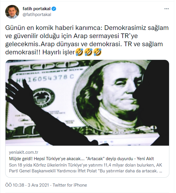 "Günün en komik haberi kanımca: Demokrasimiz sağlam ve güvenilir olduğu için Arap sermayesi TR’ye gelecekmis. Arap dünyası ve demokrasi. TR ve sağlam demokrasi!! Hayırlı işler"