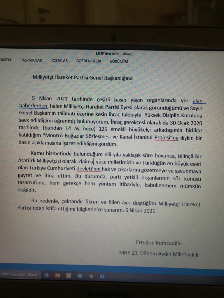 Kumcuoğlu istifa mektubunda İstanbul Kanalı ve Montrö içerikli emekli büyükelçiler bildirisine 14 ay önce imza attığını hatırlatarak,''Çoktandır Fikren ve fiilen ayrı düştüğüm Milliyetçi Hareket Partisinden istifa ediyorum'' dedi.