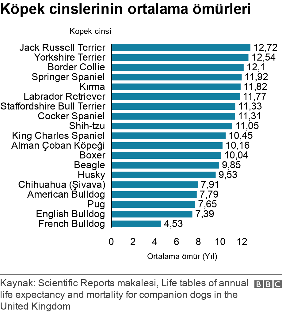 Bunu English Bulldog cinsi köpekler 7,4 yıl ile takip ederken Pug ve American Bulldog cinsi köpeklere ise 7,7 ve 7,8 yıl ortalama ömür biçilmiş.