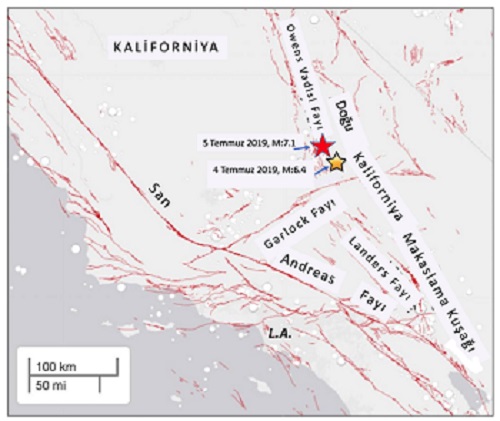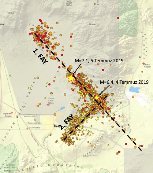 Kuzeydeki Owens Fayı, güneydeki ise üzerinde birçok ardışık tetiklemeli depremlere sahne olmuş Landers Fay kuşağıdır. Owens Fayı üzerinde 26 Mart 1872’de 7.6 büyüklüğünde, Landers Fayı üzerinde ise 29 Haziran 1992’de 7.3 büyüklüğünde deprem olduğunu biliyoruz. Bölgede ayrıca KKD-GGB doğrultusunda yerleşen ve Landers Fayı’nı kesen Garlock Fayı vardır. İşte 4 Temmuz 2019’da 6.4 büyüklüğündeki bu son deprem bu iki fay kuşağının birbirini kestiği kavşakta ortaya çıkmıştır.