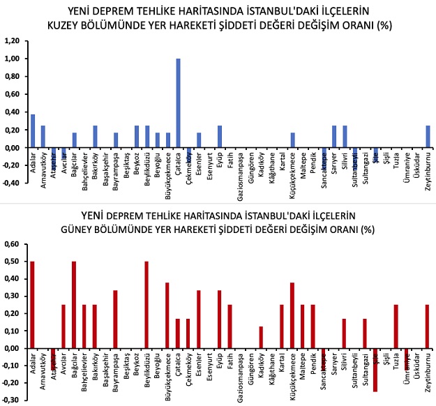 İstanbul için yaptığım hızlı bir değerlendirme ile ilçelerimiz için ortalama en büyük yer hareketi (ivme) değerlerinin artış ve azalış değerlerini yüzde olarak çizelgeyle verdim (Çizelge ve Grafik).