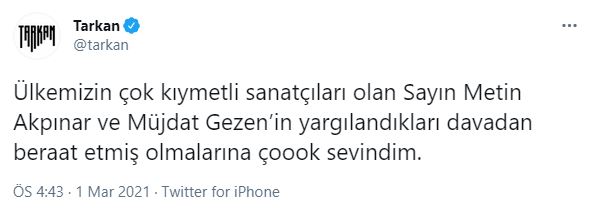 Tarkan, "Ülkemizin çok kıymetli sanatçıları olan Sayın Metin Akpınar ve Müjdat Gezen’in yargılandıkları davadan beraat etmiş olmalarına çoook sevindim" ifadelerini kullandı.