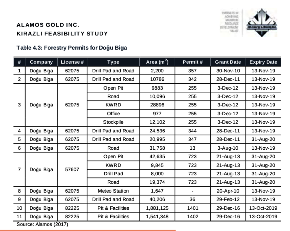 Gelelim Alamos Gold şirketine ne kadarlık bir alanda ormanda çalışma izni verildiğine. 'Güvenilir bilgi' için şirketin kendi 2017 fizibilite raporlarına başvuruyoruz.