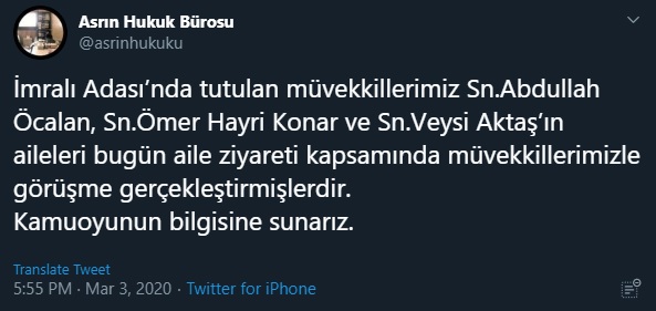 Öcalan’ın avukatlarının yer aldığı Asrın Hukuk Bürosunun sosyal medya hesabından yapılan açıklamada, “İmralı Adası’nda tutulan müvekkillerimiz Sn. Abdullah Öcalan, Sn.Ömer Hayri Konar ve Sn. Veysi Aktaş’ın aileleri bugün aile ziyareti kapsamında müvekkillerimizle görüşme gerçekleştirmişlerdir. Kamuoyunun bilgisine sunarız” ifadeleri paylaşıldı.