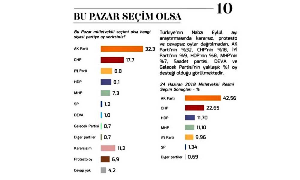 MetroPOLL’ün Eylül ayı anketinden; kararsız, protesto ve cevapsız oylar dağıtılmadan çıkan sonuçlar şöyle: