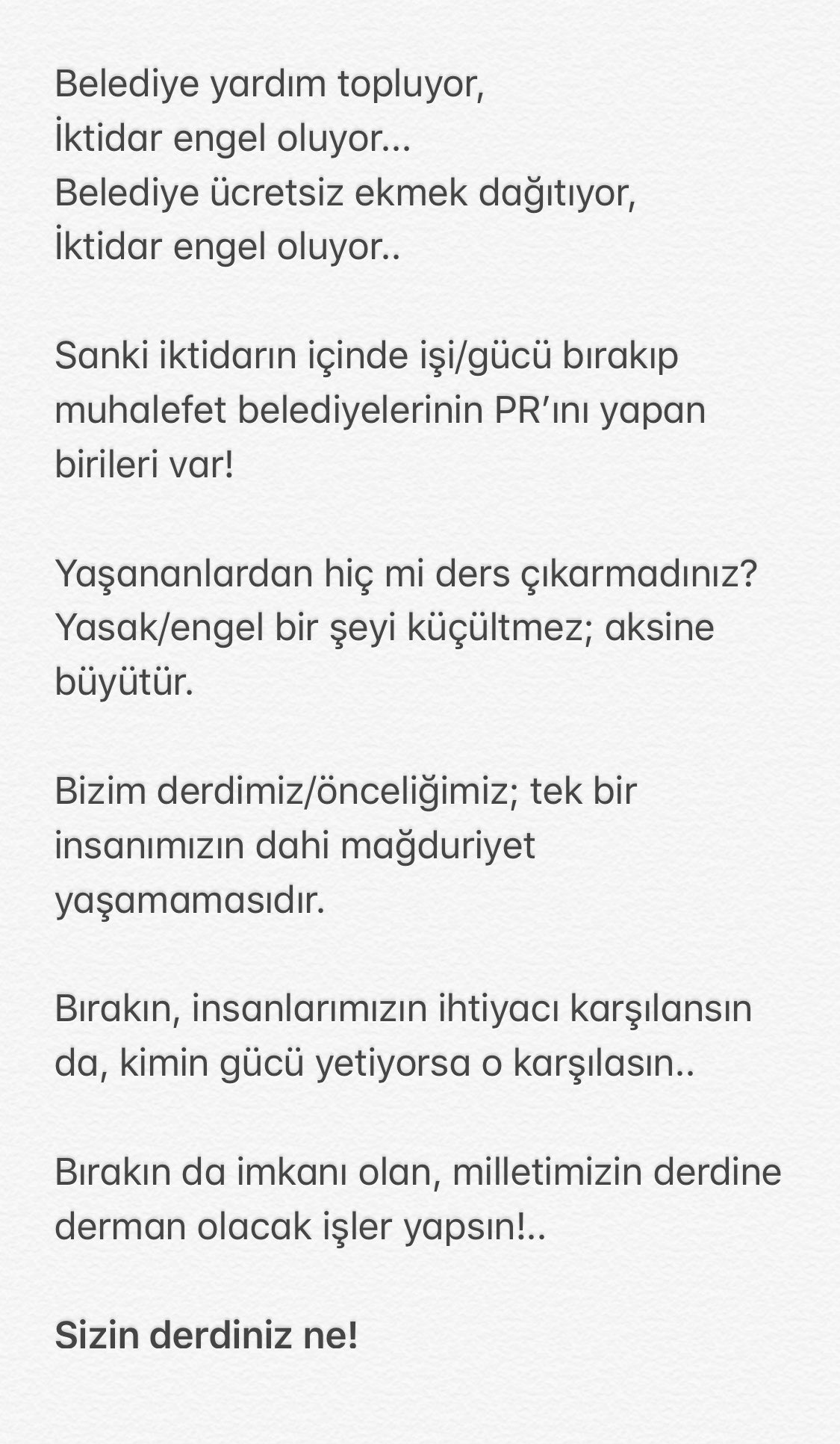 ''Belediye yardım topluyor, iktidar engel oluyor. Belediye ücretsiz ekmek dağıtıyor, iktidar engel oluyor. Sanki iktidarın içinde işi, gücü bırakıp muhalefet belediyelerinin PR’ını yapan birileri var. Yaşananlardan hiç mi ders çıkarmadınız? Yasak, engel bir şeyi küçültmez aksine büyütür. Bizim derdimiz, önceliğimiz tek bir insanımızın dahi mağduriyet yaşamamasıdır. Bırakın, insanlarımızın ihtiyacı karşılansın da, kimin gücü yetiyorsa o karşılasın. Bırakın da imkânı olan, milletimizin derdine derman olacak işler yapsın. Sizin derdiniz ne?”
