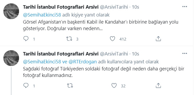 Ancak Ekinci'nin 20 yıl öncesine ait olduğunu belirttiği fotoğrafın, Türkiye'ye ait olmadığı Twitter kullanıcıları tarafından ortaya çıkarıldı. Fotoğrafın, Afganistan'daki bir yola ait görsel olduğu anlaşıldı.