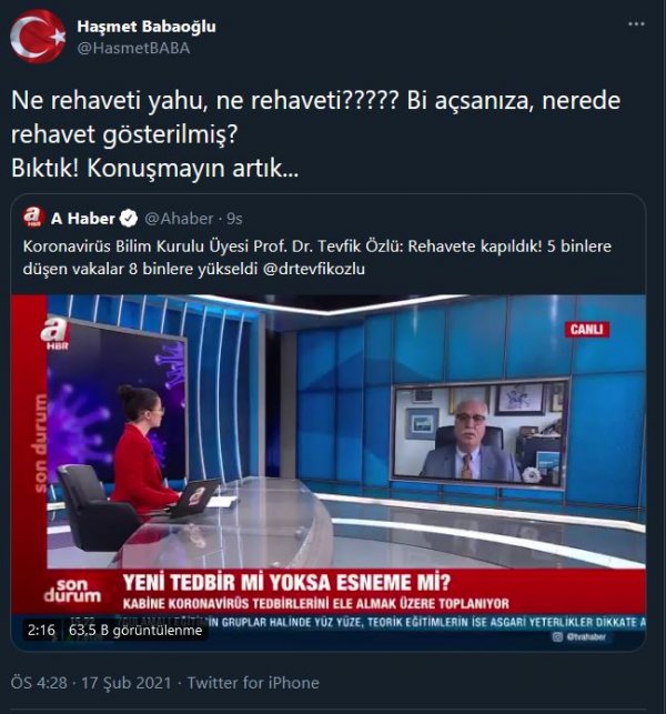 Korona virüs Bilim Kurulu Üyesi Prof. Dr. Tevfik Özlü’nün “Rehavete kapıldık! 5 binlere düşen vakalar 8 binlere yükseldi” ifadelerine tepki gösteren Babaoğlu, “Ne rehaveti yahu, ne rehaveti????? Bi açsanıza, nerede rehavet gösterilmiş? Bıktık! Konuşmayın artık...” diye yazdı.