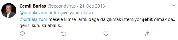 AKP’li TV yorumcusu Cemil Barlas da, “mesele kimse artık dağa çıkmak istemiyor şehit olmak da… gerisi kuru kalabalık…”, “oy talebi olan hiç kimse şehit cenazesine katılmamalı..” diye yazmıştı.