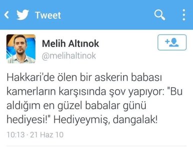 Yine Sabah gazetesinin bir başka yazarı Melih Altınok ise, attığı mesajda şehit babasına “dangalak” diye hakaret edip şöyle yazmıştı; “Hakkari’de ölen bir askerin babası kameraların karşısında şov yapıyor: ‘Bu aldığım en güzel babalar günü hediyesi!’ Hediyeymiş, dangalak!”