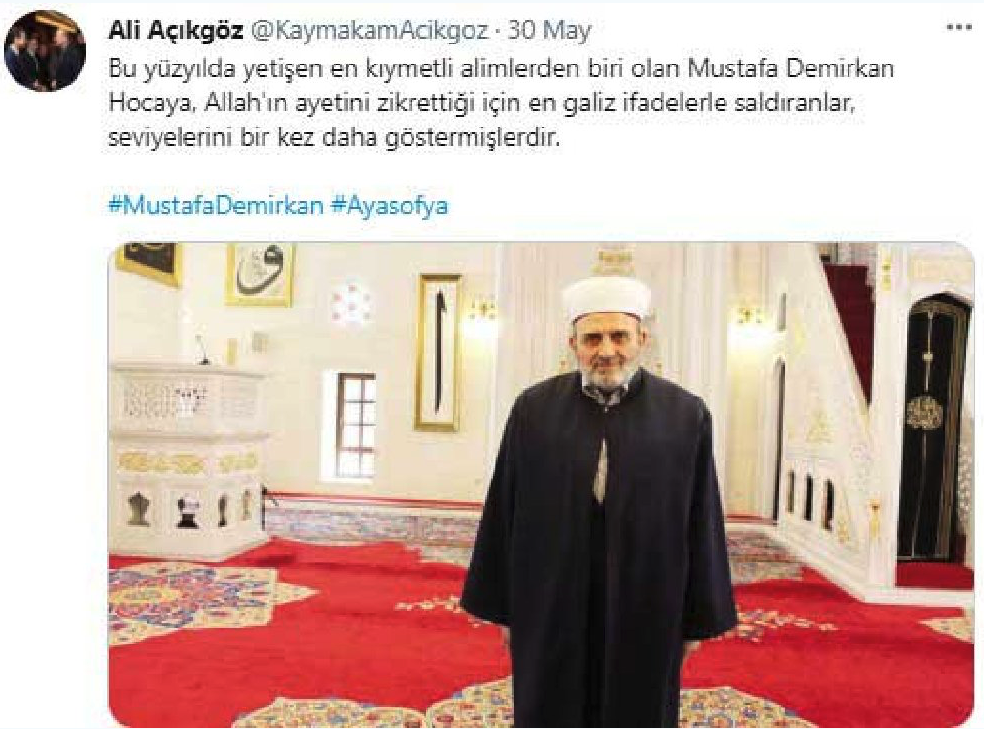 Açıkgöz sosyal medya hesabından yaptığı paylaşımda, “Bu yüzyılda yetişen en kıymetli alimlerden biri olan Mustafa Demirkan Hocaya, Allah’ın ayetini zikrettiği için en galiz ifadelerle saldıranlar, seviyelerini bir kez daha göstermişlerdir” ifadelerini kullandı.