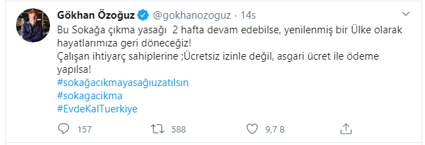 Özoğuz, "Bu sokağa çıkma yasağı 2 hafta devam edebilse yenilenmiş bir ülke olarak hayatlarımıza geri döneceğiz! Çalışan ihtiyaç sahiplerine ücretsiz izinle değil, asgari ücretle ödeme yapılsa!" paylaşımında bulundu.