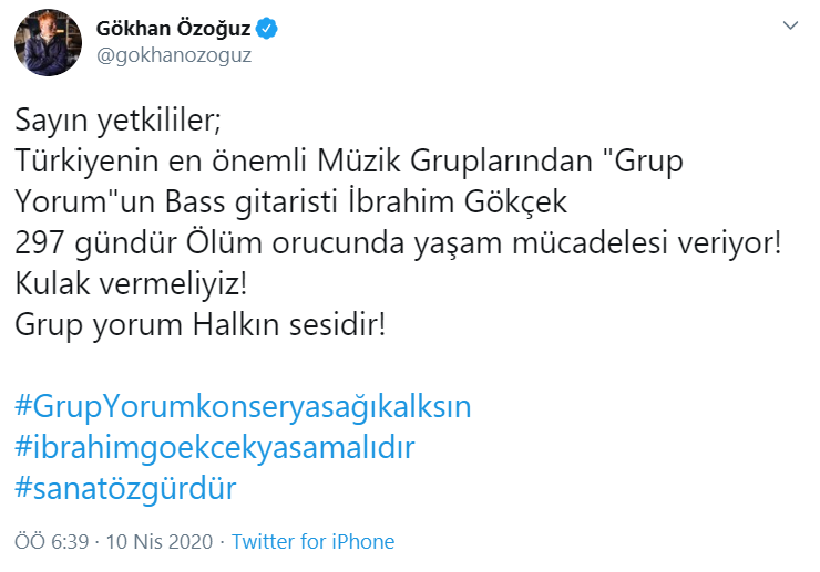 “Türkiyenin en önemli müzik gruplarından Grup Yorum’un bass gitaristi İbrahim Gökçek 297 gündür ölüm orucunda yaşam mücadelesi veriyor! Kulak vermeliyiz! Grup yorum halkın sesidir!”