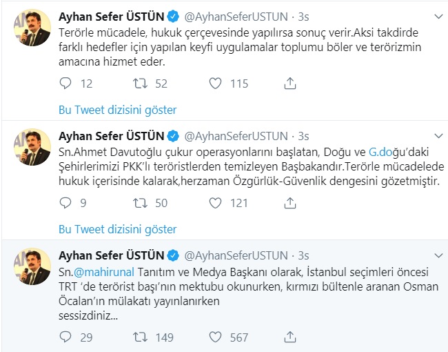 Ak Parti eski Sakarya Milletvekili Ayhan Sefer Üstün, Diyarbakır ve Van Belediye Başkanları'nın görevden alınıp yerlerine kayyım atanmasını eleştirdikleri için 11. Cumhurbaşkanı Abdullah Gül ve eski başbakan Ahmet Davutoğlu'na twitter üzerinden tepki gösteren Mahir Ünal’a, “İstanbul seçimleri öncesi TRT ‘de terörist başı’nın mektubu okunurken, kırmızı bültenle aranan Osman Öcalan’ın mülakatı yayınlanırken sessizdiniz” yanıtını gönderdi.