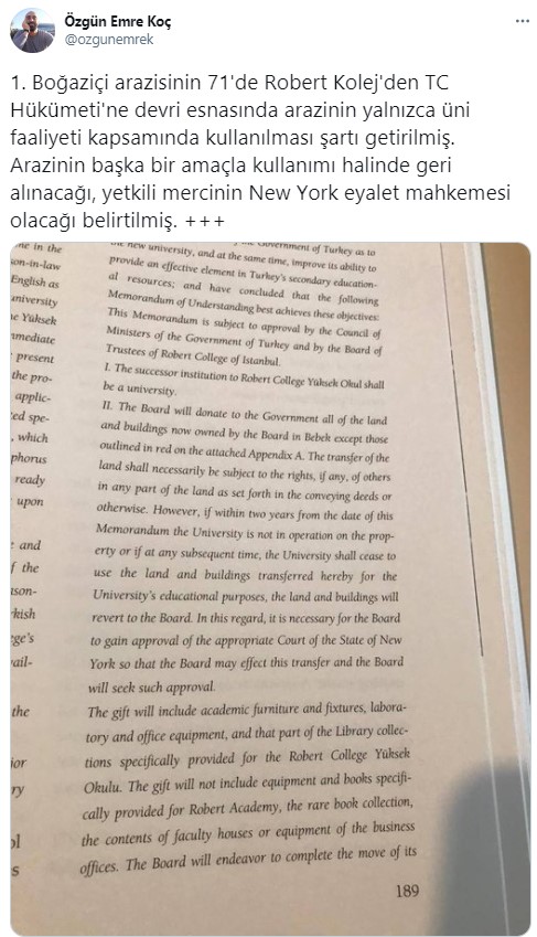 İstanbul Üniversitesi Araştırma Görevlisi Özgün Emre Koç tarafından Boğaziçi arazisiyle ilgili dikkat çeken bir belge paylaşıldı. Belgede, 1971 yılında Boğaziçi arazisinin Türkiye Cumhuriyeti tarafından Robert Koleji’nden alındığı, arazinin başka amaçlarla kullanımı durumunda, New York Eyalet Mahkemesi tarafından geri alınabileceği belirtildi.