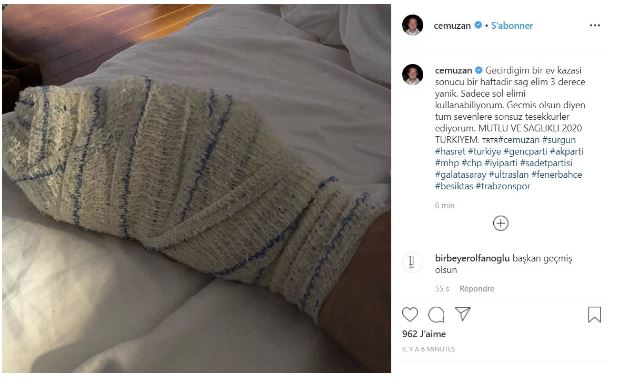 Cem Uzan’ın açıklaması şöyle: Geçirdiğim bir ev kazası sonucu bir haftadır sağ elim 3 derece yanık. Sadece sol elimi kullanabiliyorum. Geçmiş olsun diyen tüm sevenlere sonsuz teşekkürler ediyorum. Mutlu ve sağlıklı 2020 Türkiye’m.