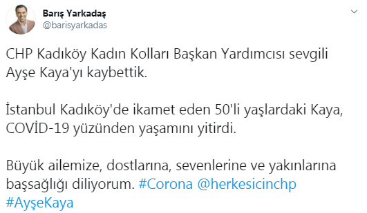 CHP Kadıköy Kadın Kolları Başkan Yardımcısı Ayşe Kaya, koronavirüsten hayatını kaybetti.