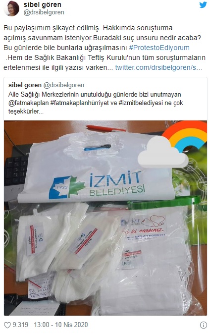 “Bu paylaşımım şikayet edilmiş. Hakkımda soruşturma açılmış, savunmam isteniyor. Buradaki suç unsuru nedir acaba? Bu günlerde bile bunlarla uğraşılmasını protesto ediyorum. Hem de Sağlık Bakanlığı Teftiş Kurulu’nun tüm soruşturmaların ertelenmesi ile ilgili yazısı varken.”