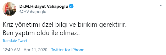 MHP Genel Başkan Yardımcısı Hidayet Vahapoğlu, sokağa çıkma yasağı kararını 22:00'de açıklayan hükümeti twitter hesabından eleştirdi. Vahapoğlu, "Kriz yönetimi özel bilgi ve birikim gerektirir. Ben yaptım oldu ile olmaz'' dedi.