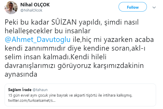 Nihal Olçok, kişisel Twitter hesabından, Davutoğlu'na yakınlığıyla bilinen Taha Ün'ün, "15 gün evvel aynı çocuk yine bayrak ve akparti tişörtü ile intihara kalkışmış" şeklindeki paylaşımını alıntılayarak, şunları yazdı: