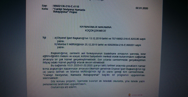 Kaymakamlık izniyle camilerin ibadethane dışında din eğitiminde de kullanılması istenilen yazıda, “Proje, okullarda da uygulanmalı” denildi.