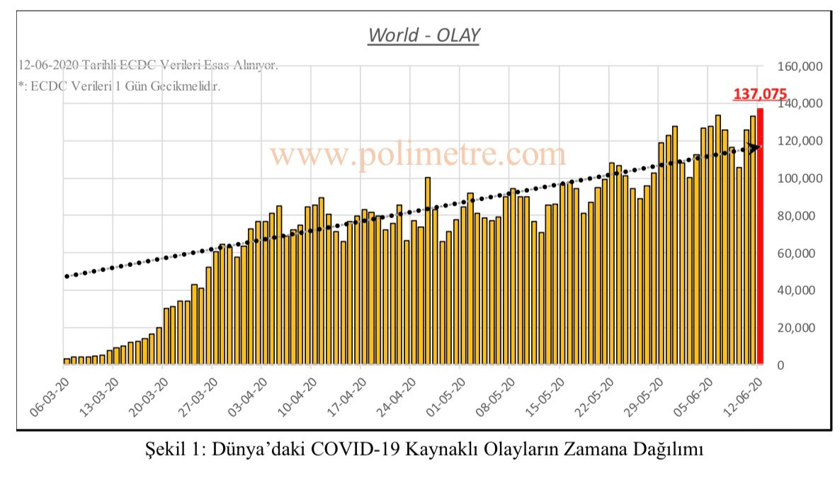 Siyasal veri analisti M. Günal Ölçer öncülüğündeki Polimetre, dünya genelinde Covid-19 kaynaklı günlük ölüm sayıları azalırken vaka sayılarının sürekli artış gösterdiğini belirtti. 12 Haziran 2020 günü dünyadaki toplam olay sayısı 137bin 75 olarak gerçekleşti.