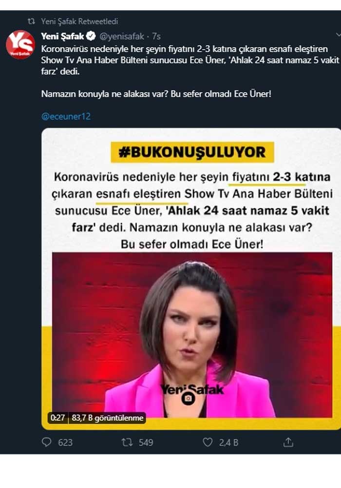 Üner’in canlı yayında fırsatçılara gösterdiği tepkiyi yandaş Yenişafak Gazetesi, “Namazla ne alakası var? Bu sefer olmadı Ece Üner!” sözleriyle hedef aldı ve resmi sosyal medya hesabından paylaştı.