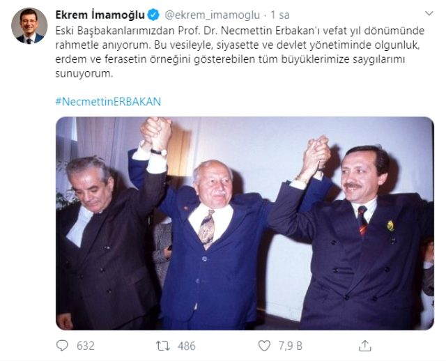 İstanbul Büyükşehir Belediye Başkanı Ekrem İmamoğlu, eski başbakanlardan Necmettin Erbakan'ın ölüm yıl dönümünde Twitter'dan ses getirecek bir mesaj ve fotoğraf paylaştı.