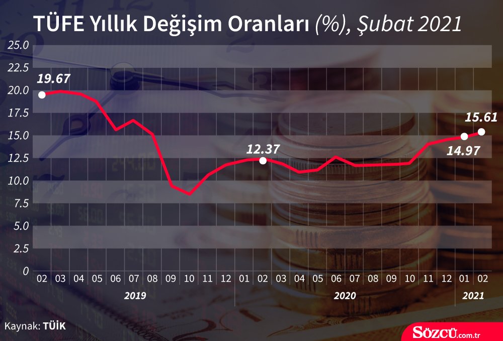 TÜFE’de 2021 yılı Şubat ayında bir önceki aya göre yüzde 0,91, bir önceki yılın aralık ayına göre yüzde 2,60, bir önceki yılın aynı ayına göre yüzde 15,61 ve on iki aylık ortalamalara göre yüzde 12,81 artış gerçekleşti.