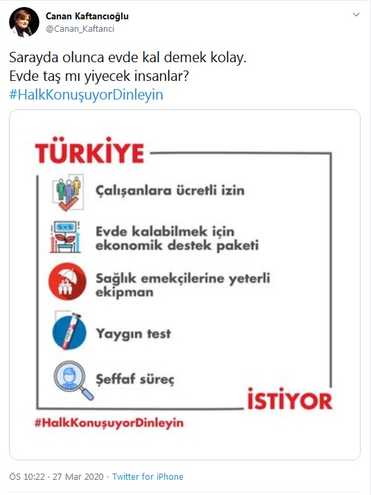 CHP'li Canan Kaftancıoğlu, 1000 odalı Sarayı'nda yaptığı açıklamada sokağa çıkma yasağı yerine "Gönüllü karantinaya uyalım" çağrısında bulunan Erdoğan'a, "Sarayda olunca evde kal demek kolay. Evde taş mı yiyecek insanlar?" diyerek tepki gösterdi.