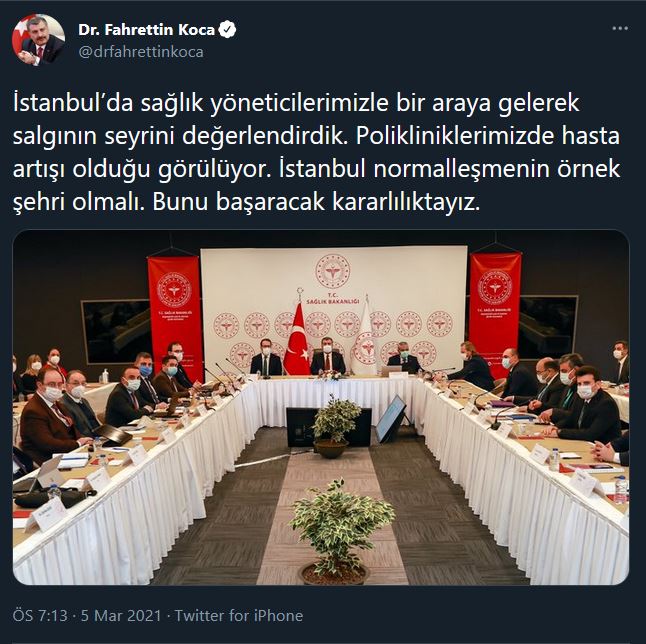 Sağlık Bakanı Fahrettin Koca, toplantı sonrası yaptığı paylaşımında, "İstanbul'da polikliniklerimizde hasta artışı olduğu görülüyor. İstanbul normalleşmenin örnek şehri olmalı. Bunu başaracak kararlılıktayız" ifadelerini kullandı