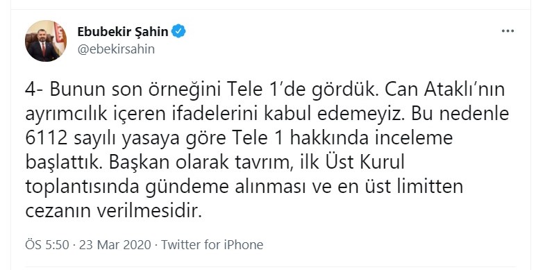 Bildirici, Taşçı’yı “ihsas-ı rey’de bulunmak” ile suçlayan RTÜK Başkanı Ebubekir Şahin’in bugüne değin çok kez Üst Kurul toplantısı öncesinde oyunun rengini açıkladığını ifade etti. Bildirici, Ebubekir Şahin’in “ihsas-ı rey”lerine Can Ataklı, Sevda Noyan ve Merdan Yanardağ hakkındaki sosyal medya paylaşımlarını örnek verdi. Ebubekir Şahin’in sosyal medyada yazdıklarının görsellerini de paylaşan Bildirici, Twitter’da şunları yazdı: