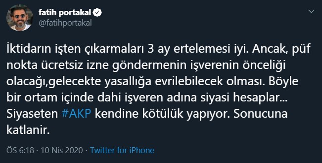 Sosyal paylaşım sitesi Twitter hesabından paylaşım yapan Fatih Portakal, 'Böyle bir ortam içinde dahi işveren adına siyasi hesaplar... Siyaseten AKP kendine kötülük yapıyor. Sonucuna katlanır" diyerek eleştirdi.