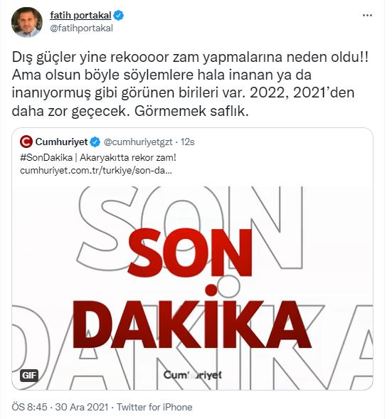 Fatih Portakal ise ekonomik kriz yaşayan Türkiye’de temel gıda ürünlerinden teknoloji ürünlerine kadar her şeye zam gelmesinin sebebinin “dış güçlerin” olduğunu savunanları eleştirdi.