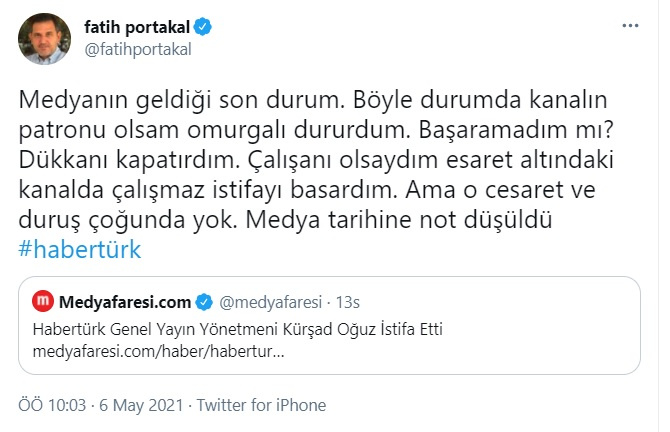 ''Medyanın geldiği son durum. Böyle durumda kanalın patronu olsam omurgalı dururdum. Başaramadım mı? Dükkanı kapatırdım. Çalışanı olsaydım esaret altındaki kanalda çalışmaz istifayı basardım. Ama o cesaret ve duruş çoğunda yok. Medya tarihine not düşüldü #habertürk''