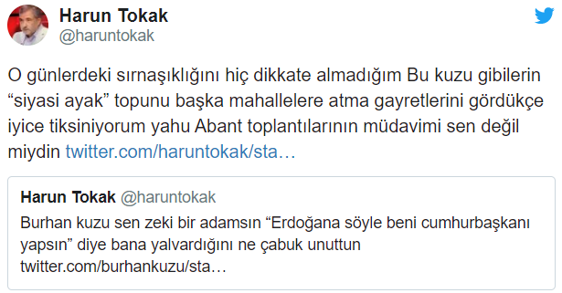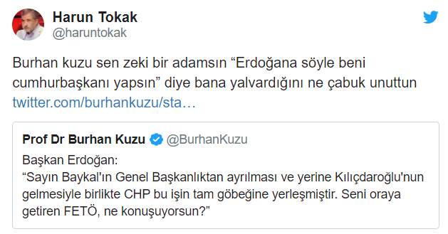 FETÖ'cü Harun Tokak, Kuzu'nun söz konusu paylaşımı için, "Burhan Kuzu sen zeki bir adamsın" derken, "'Erdoğan'a söyle beni cumhurbaşkanı yapsın' diye bana yalvardığını ne çabuk unuttun" diye yazdı.