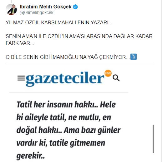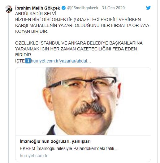Eski Ankara Büyükşehir Belediye Başkanı Melih Gökçek, Hürriyet yazarı Abdulkadir Selvi'yi eleştirdi. Gökçek, Selvi'nin İstanbul Büyükşehir Belediye Başkanı Ekrem İmamoğlu'na 'yağ çektiğini' savundu.