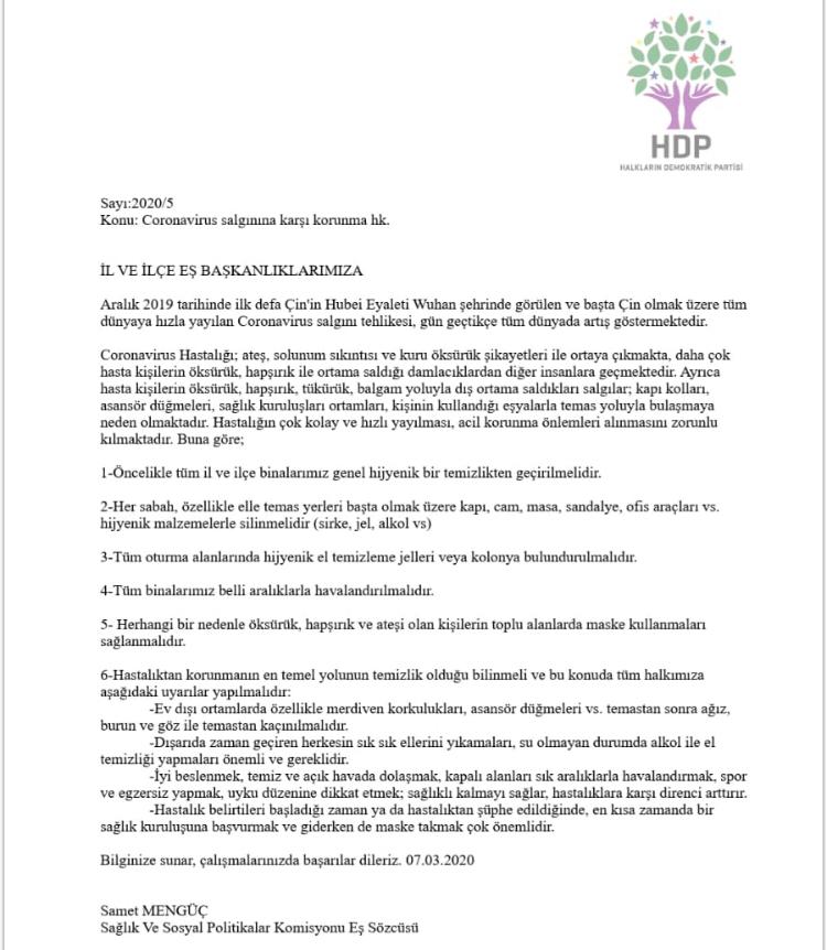 Halkların Demokratik Partisi (HDP), Sağlık ve Sosyal Politikalar Komisyonu Eş sözcüsü Samet Mengüç imzasıyla tüm il ve ilçe örgütlerine coronovirüs saldırısına karşı alınacak önlemlerle ilgili bir genelge gönderdi.