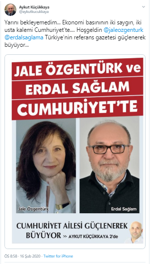 Erdal Sağlam ve Jale Özgentürk'ün Cumhuriyet Gazetesi ile anlaştığını Genel Yayın Yönetmeni Aykut Küçükkaya sosyal medya hesabından böyle duyurdu: