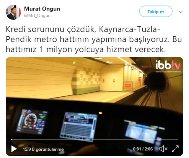 Ongun, "Kaynarca-Tuzla-Pendik metro hattının yapımına başlıyoruz. Bu hattımız 1 milyon yolcuya hizmet verecek." paylaşımı yaptı.