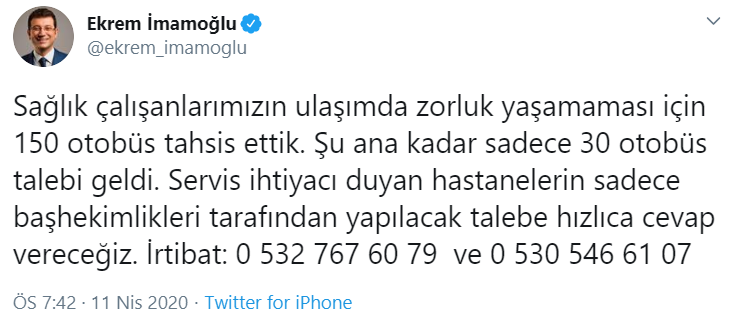 Şu ana kadar 30 otobüs talebi geldiğini açıklayan İmamoğlu talepler için irtibat numaralarını da paylaşarak “Servis ihtiyacı duyan hastanelerin sadece başhekimlikleri tarafından yapılacak talebe hızlıca cevap vereceğiz.