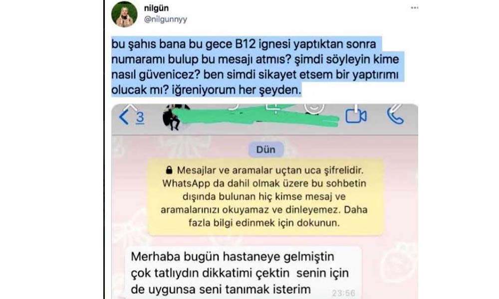 Sosyal medyada bir kadın, B12 iğnesi yaptırmak için gittiği hastanede iğneyi yapan sağlık personelinin kendisine gece mesaj attığını yazdı.