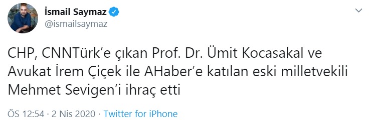 Gazeteci İsmail Saymaz da bugün, CHP üyesi Prof. Dr. Ümit Kocasakal ve eski CHP Milletvekili Mehmet Sevigen'in benzer sebeplerle partiden ihraç edildiğini yazdı.