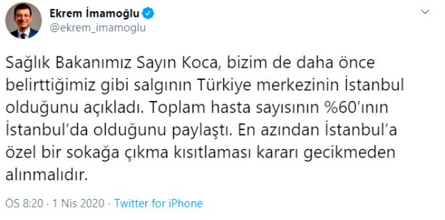 Sağlık Bakanı'nın bu açıklamalarının ardından İstanbul Büyükşehir Belediye Başkanı Ekrem İmamoğlu, sosyal medya hesabından bir paylaşımda bulundu. Sokağa çıkma yasağı getirilmeli çağrısını yineleyen İmamoğlu, şu ifadeleri kullandı: "Sağlık Bakanımız Sayın Koca, bizim de daha önce belirttiğimiz gibi salgının Türkiye merkezinin İstanbul olduğunu açıkladı. Toplam hasta sayısının %60'ının İstanbul'da olduğunu paylaştı. En azından İstanbul'a özel bir sokağa çıkma kısıtlaması kararı gecikmeden alınmalıdır."