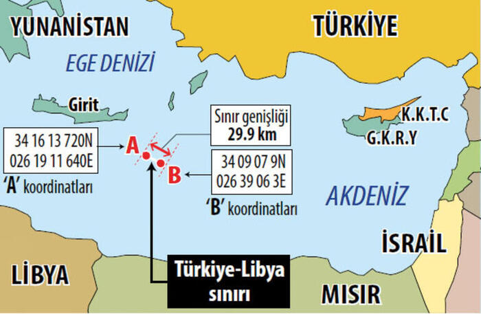 Türkiye’nin Libya ile imzaladığı Doğu Akdeniz’de iki ülke arasındaki deniz sınırlarını belirleyen ve özellikle komşu ülkeleri panikleten haritanın detayları hükümetin anlaşmayı TBMM’ye taşımasıyla ortaya çıktı. Yunanistan’ın Libya’ya nota verdiği, AB’nin ‘Açıklayın’ dediği anlaşma, Yunanistan’ın Girit Adası’nın güneydoğusunda Türkiye ile Libya arasında 18.6 millik bir deniz sınırı öngörüyor.