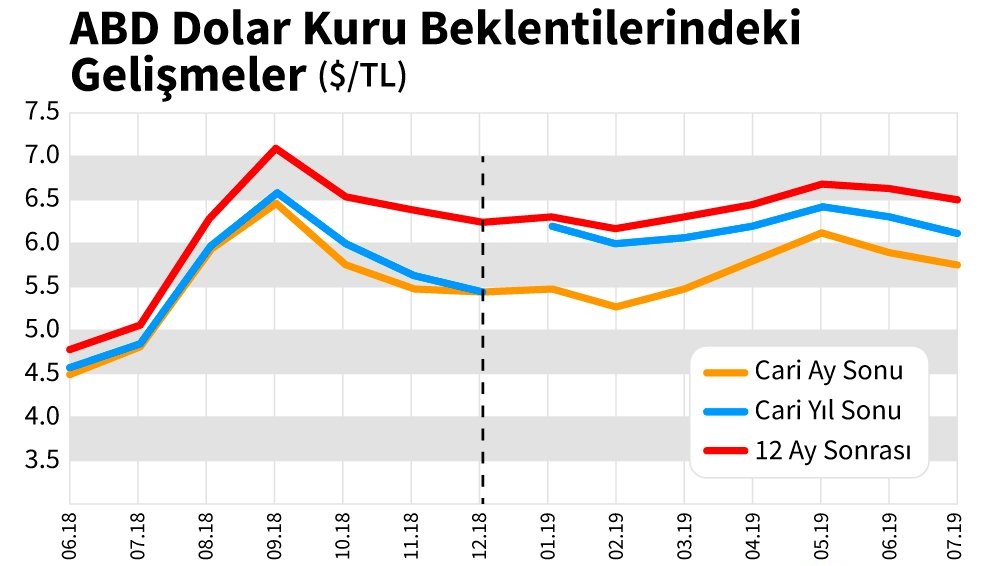 12 ay sonrası döviz kuru beklentisi ise aynı anket dönemlerinde sırasıyla 6,64 TL ve 6,47 TL olarak gerçekleşti.