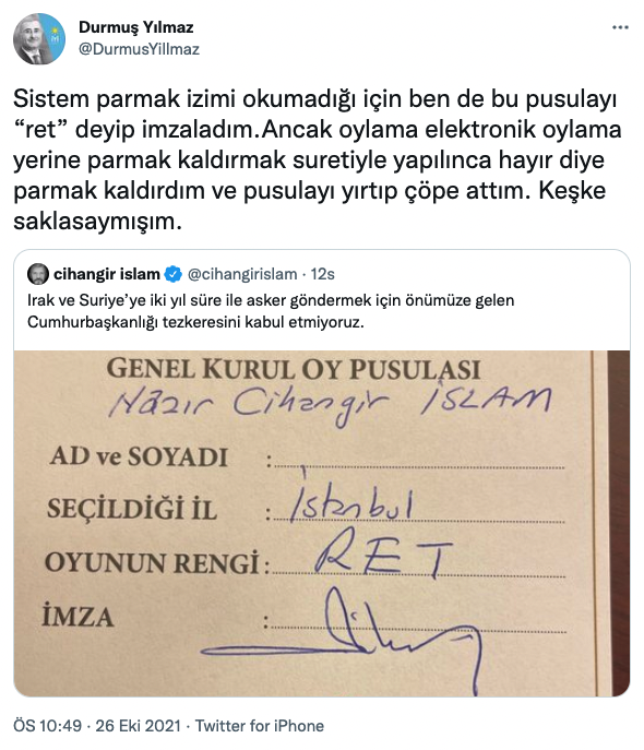 CHP İstanbul Milletvekili Cihangir İslam'ın oy pusulasını paylaştığı tweeti alıntılayan Yılmaz, "Sistem parmak izimi okumadığı için ben de bu pusulayı "ret" deyip imzaladım. Ancak oylama elektronik oylama yerine parmak kaldırmak suretiyle yapılınca hayır diye parmak kaldırdım ve pusulayı yırtıp çöpe attım. Keşke saklasaymışım." ifadelerini kullandı.