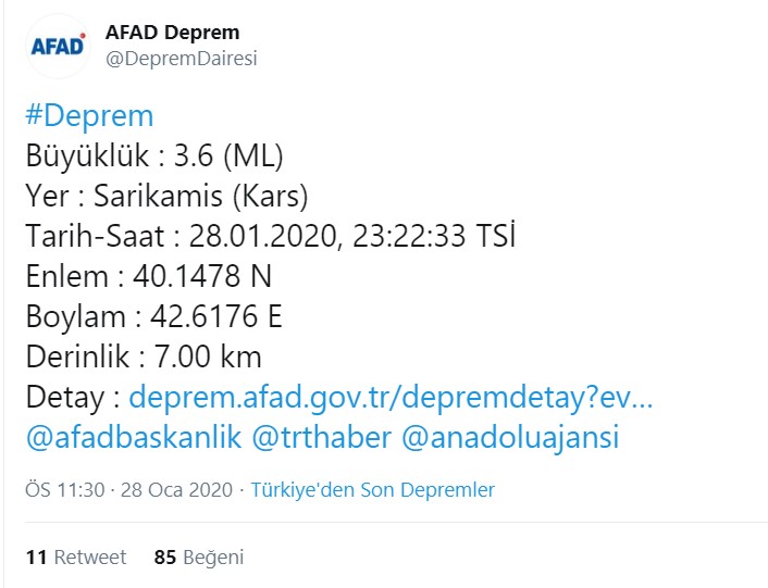 Kars Sarıkamış'ta 23.22'de 3.6 büyüklüğünde deprem meydana geldi. Meydana gelen depremin derinliği, 7.0 km olarak açıklandı.