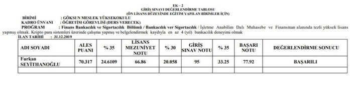 Yabancı dil puanı ise 70. Üniversite tarafından kendisine verilen giriş notunun 95 olmasıyla başarı notu da 78’e yükselen Seyithanoğlu, eniştesinin müdür olduğu yüksekokulda öğretim görevlisi olarak ders vermeye başladı. Enişte Doç. Dr. Orhan Ercan 13 Aralık 2018’de Göksun Meslek Yüksekokulu’na müdür olarak atanmıştı.